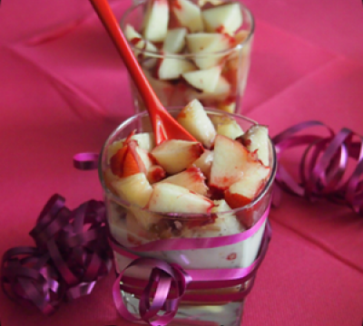 Coupez les pêches en petits dés et mettez les sur le fromage blanc.