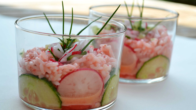 Disposez des tranches de radis et de concombre sur le pourtour des verrines et remplissez-les avec le riz à la vinaigrette... Garnir avec les dés de concombre et de radis et quelques brins de ciboulette...