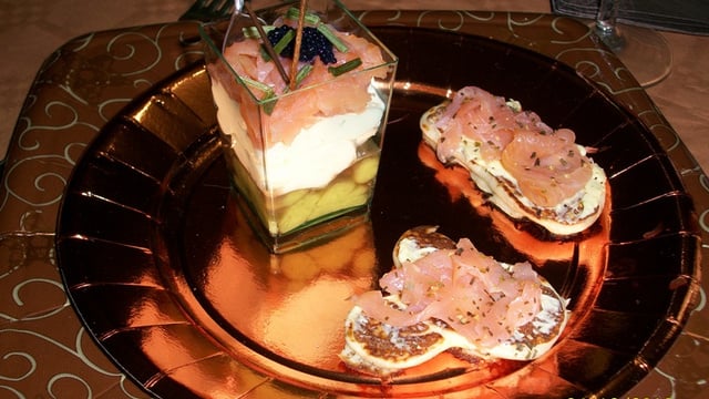 Couper le saumon en petits dés puis l'ajouter au dessus de la crème au boursin. - 2