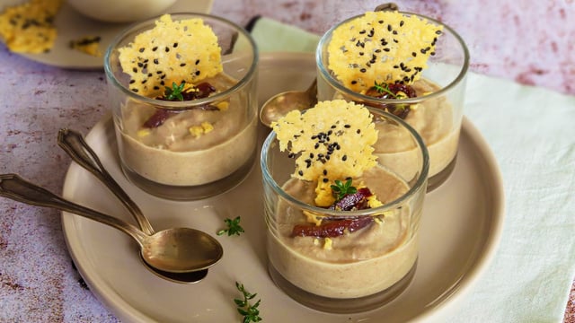 Dans ce verrines, l'oignon caramélisé apporte de la rondeur à la saveur marquée de sous-bois des champignons, et la tuile au parmesan et aux graines de sésame noir apporte du croquant et de la gourmandise. L'avantage, c'est que vous pouvez préparer le velouté même quelques jour à l'avance et le réchauffer le jour J, avant de dresser les verrines. A vos tabliers !