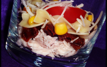 Ajouter les pâtes froides et mélanger, servez dans des verrines et parsemer de fromage râpé.