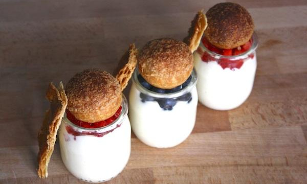Dresser en verrine, en garder une partie pour fourrer vos choux. Pour garnir vos choux percer un trou en dessous puis les garnir avec la crème pâtissière légère. Dresser vos verrines comme sur la photo.