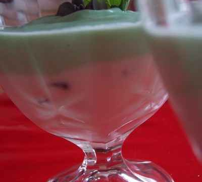 Mélanger les 2 yaourts avec le sucre et le mascarpone. Dans une coupe déposer 2 c à s de créme et 1 c à s de pépites de chocolat. Mélanger délicatement. Dans le reste de créme ajouter le sirop et mélanger. Verser cette deuxiéme créme sur la premiére. Façonner votre décor avec les pépites et les feuilles de menthe.