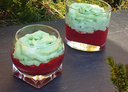 Juste avant de servir, mettre un peu de chantilly à la pistache sur chaque verrine et servir aussitôt.