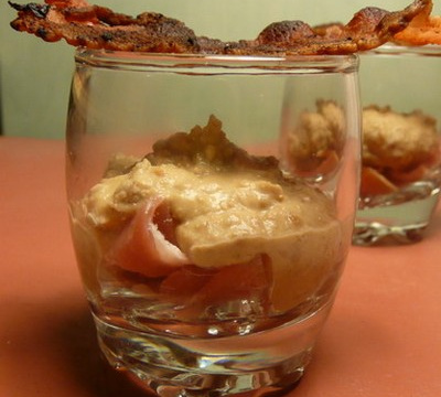 Couper les tranches de poitrine en deux, les faire cuire jusqu'à ce qu'elles soient bien croustillantes. Les disposer au dessus des verrines.