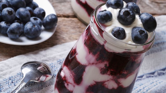- 3Versez dans les verrines et ajoutez les myrtilles entières en les dispatchant. Mettez au frais.