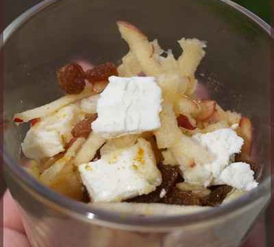 Laver et couper en julienne les pommes. Les arroser de jus de citron et d'huile d'olive. Ajouter le fromage coupé en dés et les raisins. Mélanger.
