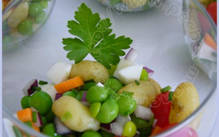 Écossez les petits pois. Faites les blanchir 5 minutes dans une eau bouillante salée, additionnée d'une pointe de couteau de bicarbonate, pour qu'ils restent bien vert. Rincez les à l'eau froide et réservez les. Pelez les pommes de terre et faites les cuire 5 minutes dans une eau bouillante salée. (Vérifiez la cuisson suivant la grosseur). Pelez et coupez les carottes en cubes ou en rondelles si elles sont petites.