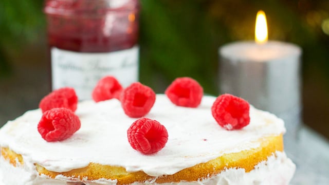 Ajoutez un peu (ou beaucoup, tout dépend du look que vous recherchez pour votre dessert!) de crème fouettée sur le dessus, puis décorez avec quelques framboises fraîches (ou congelées, mais alors déposez-les encore surgelées sur le gâteau).