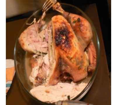 6. Sortez la dinde du four, et pour servir, coupez-la en morceaux.