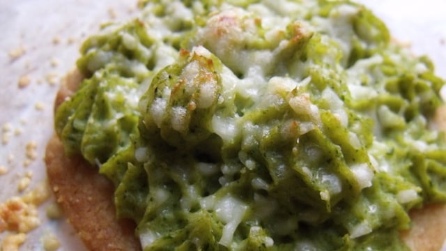 Une purée de brocoli et patate douce, sur un sablé au parmesan, légèrement parfumé au curry