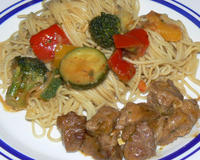 400g d'agneau, 1/2 poivron rouge, 1/2 poivron jaune, 1 petite courgette, quelques haricots verts et fleurettes de brocolis, huile de sésame, purée de piment, sauce spécial wok, lait de coco