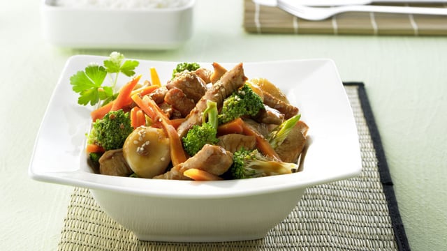 Ajouter les légumes et les faire cuire durant environ 5-10 minutes, tout en remuant. Ajouter les châtaignes, faire chauffer brièvement et assaisonner avec la Sauce Wok Kikkoman. Servir parsemé de graines de sésame, accompagné de riz.