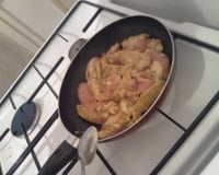 Couper les filets de poulet en petits morceaux et les ajouter dans la poêle. Saler et poivrer.
