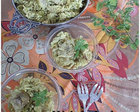 Cuire le riz (basmati) comme indiqué sur le paquet, l'égoutter, le refroidir et l'égoutter à nouveau. Ajouter à la préparation.