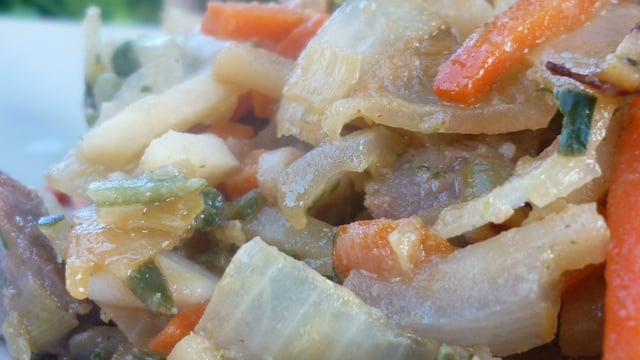 Ajouter la julienne de légumes, puis les lanières de viande.
