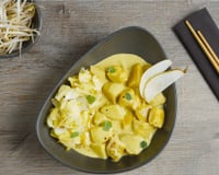 Dans un wok ou une sauteuse, verser un filet d’huile et déposer les morceaux de filet. Faire revenir pendant 3 minutes. Ajouter l’échalote et le curry et mélanger. Laisser dorer pendant 5 minutes. Ajouter le lait de coco et les morceaux de poires. Laisser mijoter pendant 10 minutes.