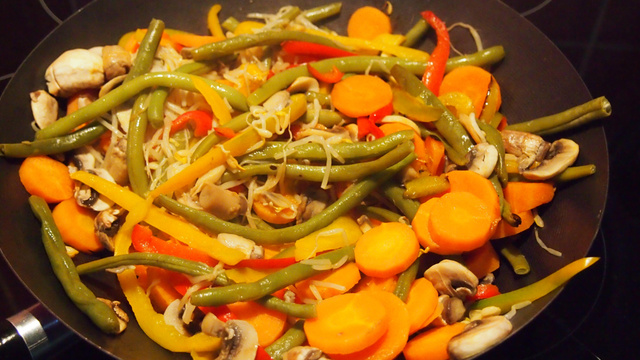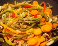 Faites chauffer l'huile dans un wok, quand elle est bien chaude, ajoutez tous les légumes et faites-les sauter à feu vif pendant 10 min en remuant sans arrêt.