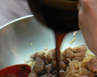 Dans une casserole, verser le sucre et le laisser colorer pour faire un caramel à sec. Mélanger petit à petit dès que le sucre fond pour faire caraméliser le tout. Ajouter alors la sauce soja, le gingembre en poudre. Verser ensuite le tout sur les morceaux de porc et les enrober de caramel.
