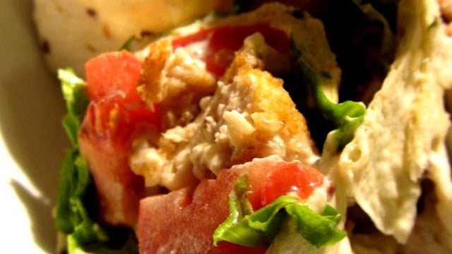 Une fois les nuggets cuits, les couper en 2 ou 3, puis les disposer sur la tortilla, entre les tomates et arroser des deux sauces. Fermer le wrap et déguster.