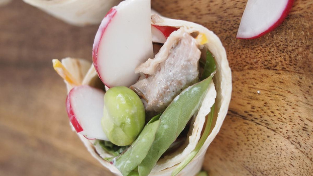 Ajoutez dessus les radis émincés, les zestes d'oranges, les pousses, les fèves et l'émincé d'agneau puis le reste de sauce. Roulez le wrap et découpez le en tronçons. Mangez immédiatement.