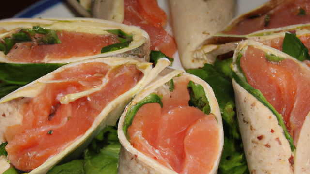 Préparer deux wraps au saumon : déposer une feuille de salade, une tranche de saumon fumé, quelques lamelles de concombre sur deux des tortillas. Rouler le tout en serrant bien, mais en prenant soin de ne pas déchirer les tortillas. Attention, il ne faut pas trop mettre de garniture si on veut réussir cette opération sans problème. Maintenir éventuellement avec un cure-dent.
