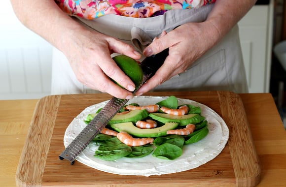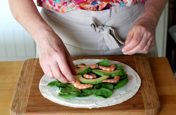 5Ajoutez 1/4 des tranches d'avocat sur la moitié inférieure de la tortilla. Ajoutes 5 crevettes en dessous et au dessous de l'avocat.