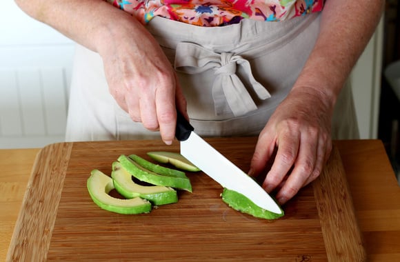 2Coupez les avocats en deux, retirez le noyau puis la peau. Coupez les demi-avocats en tranches et ajoutez un peu de jus de citron vert.