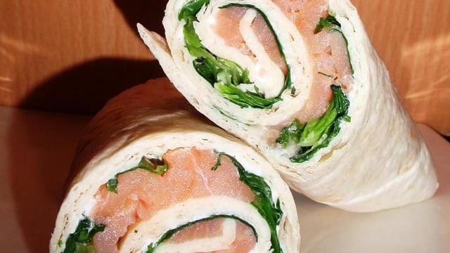 Rouler la galette et la couper en 2 petits wraps. Maintenir avec des pics en bois.
