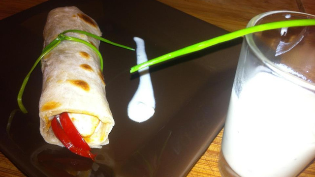 Wraps de poulet avec une garniture de poivrons à la sauce roquefort.