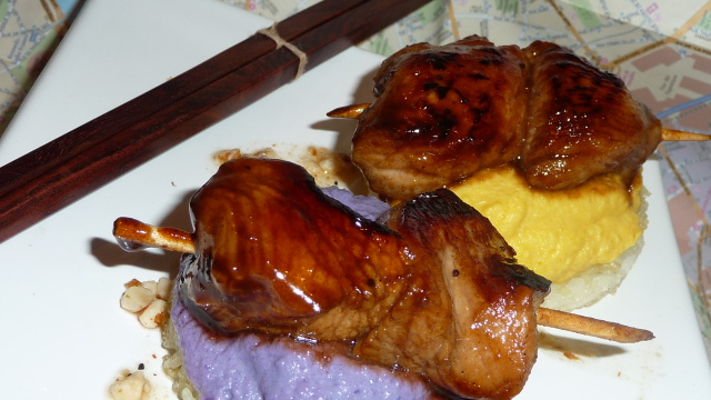 Mini brochettes de veau marinées et cuites façon Yakitoris, épicées au mélange Shichimi, proposées sur des galettes de riz légèrement croquantes et des mousselines de chou fleur ... l'une orangée, l'autre mauve ... le tout rehaussé d'une vinaigrette à la noisette