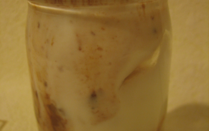 Fouettez le yaourt avec le sucre puis ajoutez le lait en poudre et le lait tiède.
