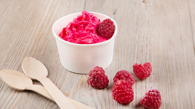 Lavez et coupez 1/4 des framboises et mettez les de côté. Dans le bol du mixeur, mettez les yaourts, les framboises restantes et 3 pots de sucre en poudre.