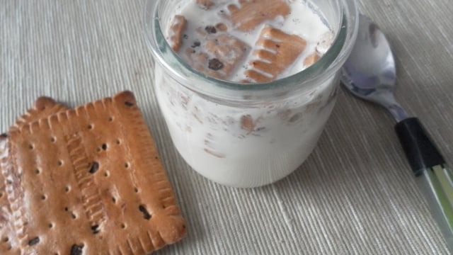 Mettez 1,5 biscuits dans le fond de votre pot de yaourt, versez le lait par dessus.