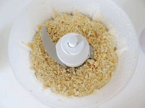 2Hacher grossièrement les noix de cajou dans le robot. Verser les noix dans le saladier et mélanger le tout.