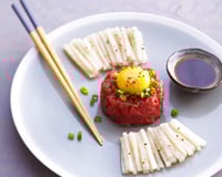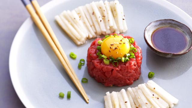 Recette traditionnelle mongole et coréenne, à base de viande de bœuf, généralement hachée gros, coupée en petits cubes au couteau, souvent servie finement hachée à la main.